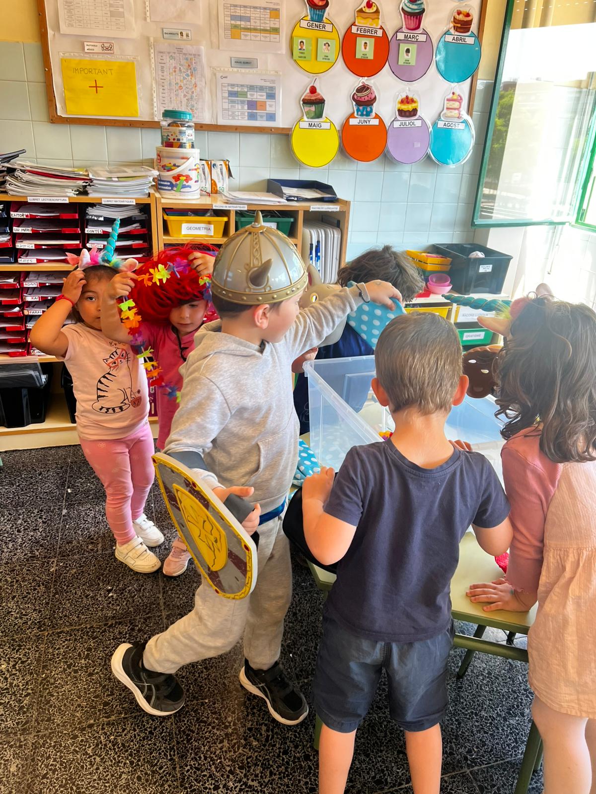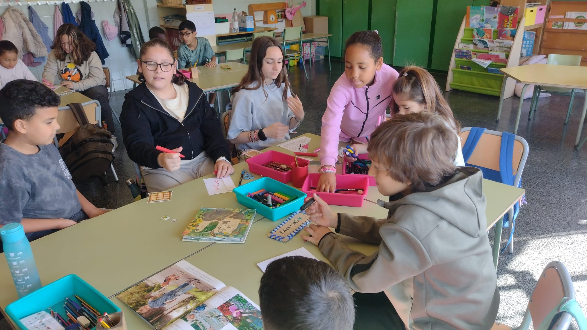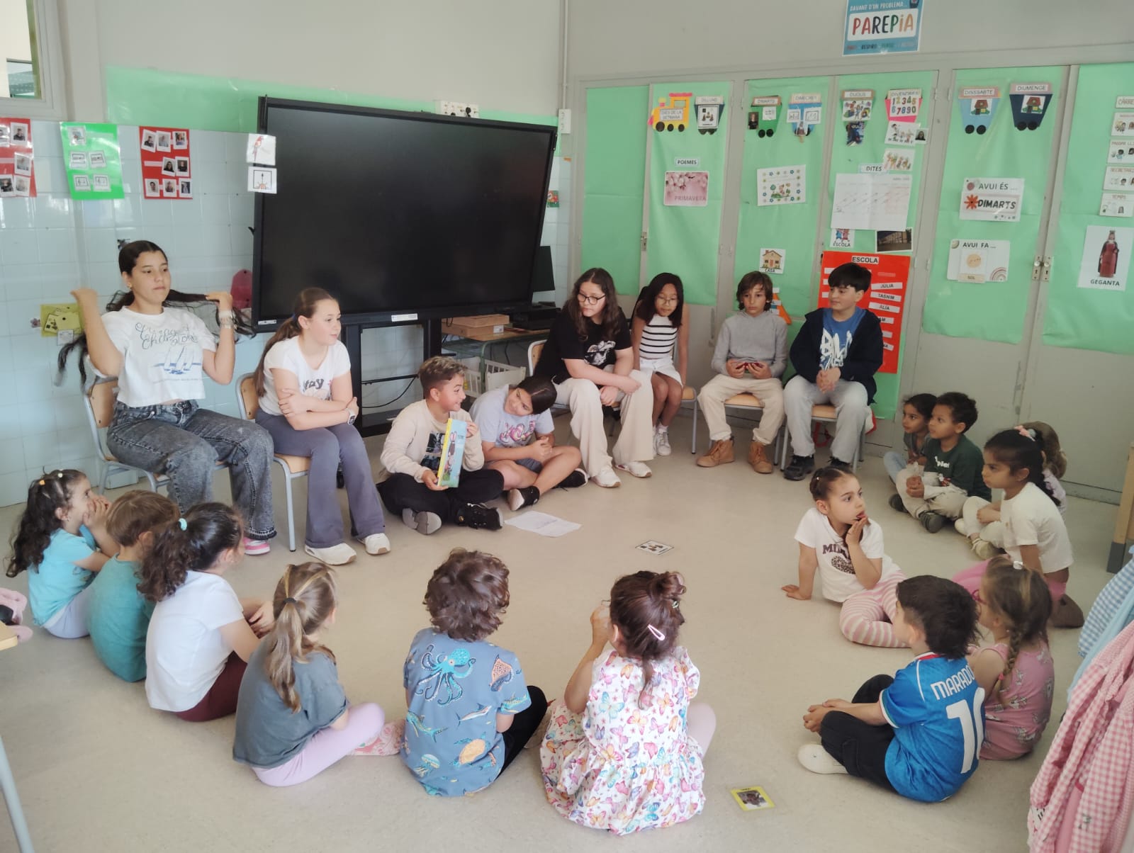 Dimecres vam començar treballant l’expressió escrita: cada curs va escollir una tipologia textual i van elaborar les seves creacions. Els nens i nenes de 6è van escollir fer una activitat molt especial: van preparar-se diferents contes, que van explicar als més petits/es de l’escola. Als nens i nenes d’Infantil els va encantar rebre aquesta sorpresa 💚! També vam fer el nostre primer taller: un detallet per regalar-se entre padrins/es i fillols/es.