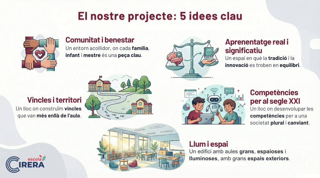Durant el curs 2023-24 l’escola va engegar un procés de reflexió sobre el funcionament, la metodologia i l’organització, amb l’objectiu d’ajustar al màxim el projecte educatiu del centre a la nostra realitat educativa i a les necessitats del context. D’una banda, aquest procés va estar impulsat pel canvi de Currículum, orientat a l’assoliment d’unes competències bàsiques que s’han de desenvolupar a partir de situacions contextualitzades, properes i significatives pels infants. D’altra banda, va haver un canvi en l’equip directiu del centre i, en conseqüència, es van reorientar els objectius a assolir al llarg dels propers anys.
