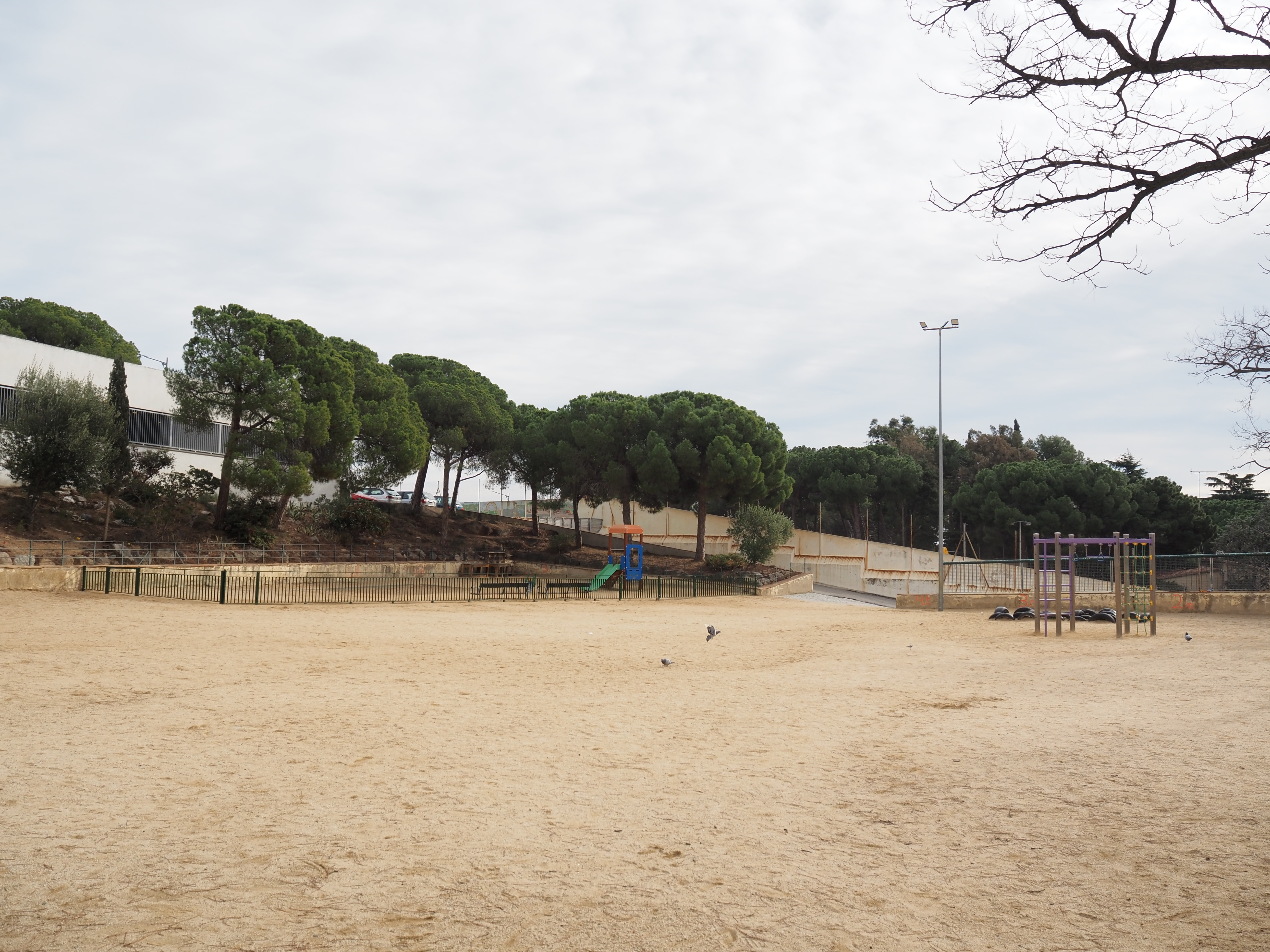 A més, l’escola té un gran espai exterior, també distribuït en tres pisos: hi ha una pista gran, un pati de sorra i al pis superior hi ha l’entrada de l’escola, juntament amb el menjador.