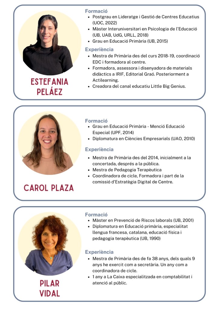 Durant el curs 2025-26 comptem amb un total de 19 mestres repartits en les dues etapes: educació infantil i primària. A més, comptem amb dues persones del personal PAS (Personal d’Administració i Serveis), que són una administrativa i una conserge, imprescindibles per al bon funcionament del centre. Comptem també amb dues vetlladores que atenen a infants amb NEE, i un tècnic/a d’integració social (TIS).